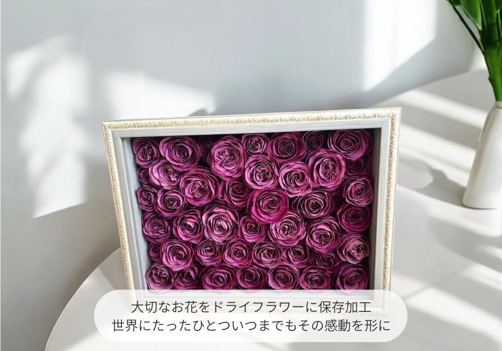 cadre souvenir〈カドル スブニール〉に入らない場合や、たくさんの花をすべて残したい方は、お花の本数や大きさにあわせてオーダーフレームになりますのでご相談、お見積りとなります。