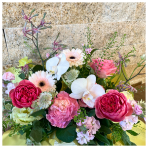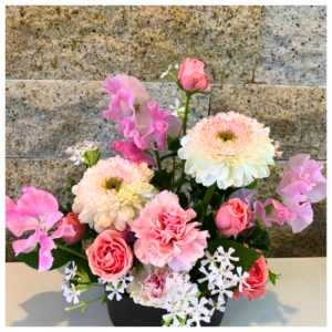 - 使用花材:ガーベラ、カラー、ダリア、デンファレ、スイートピー、グリーンなど季節の花材でおまかせとなります。
