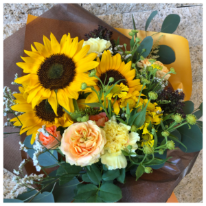 - 使用花材:ひまわり、ヘレニウム、バラ、スターチス、カーネーション、グリーンなど季節の花材でおまかせとなります。