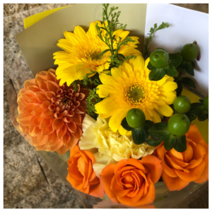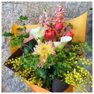 - 使用花材:ガーベラ、カーネーション、スプレーバラ、ヒペリカム、グリーンなど季節の花材でおまかせとなります。