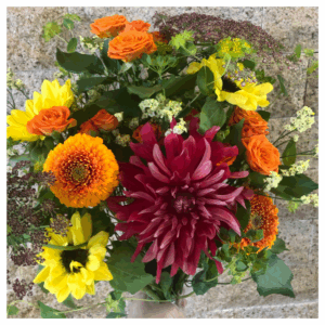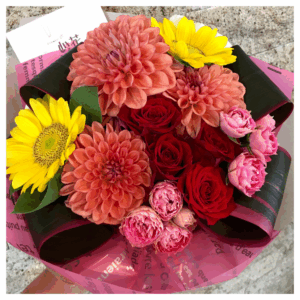 - 使用花材:ひまわり、スターチス、スプレーバラ、ダリア、ブプレリューム、グリーンなど季節の花材でおまかせとなります。