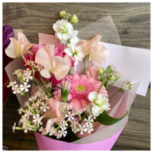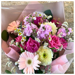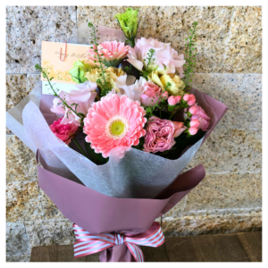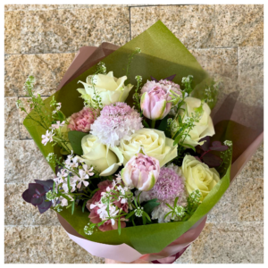 - 使用花材:ガーベラ、スイートピー、シレネ、ストック、グリーンなど季節の花材でおまかせとなります。