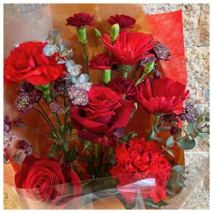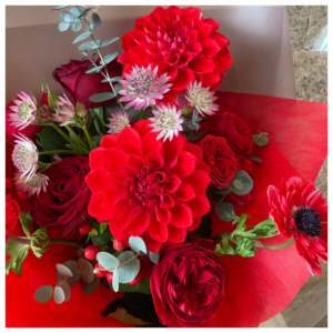 - 使用花材:バラ、ダリア、ヒペリカム、スプレーバラ、アネモネ、グリーンなど季節の花材でおまかせとなります。