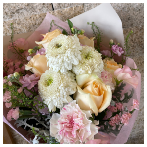 - 使用花材:バラ、カーネーション、ストック、タラスピ、スプレーバラ、グリーンなど季節の花材でおまかせとなります。