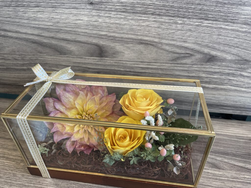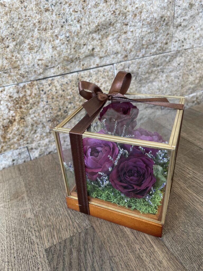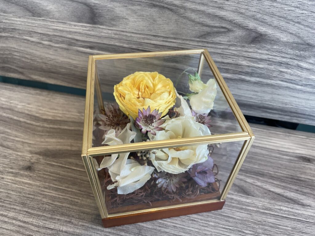 ベースサイズW105×H105×D105幅・奥行・高さがすべて105mmのコンパクトな手のひらサイズ。小さな空間にも収まるサイズ感で、「飾る場所が限られている」「メインの花だけをコンパクトに残したい」というご要望に最適です。