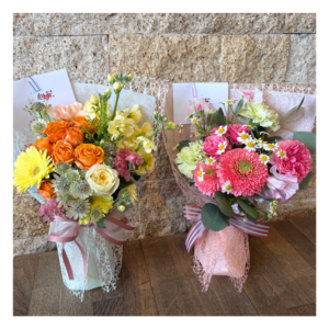 - 使用花材:カーネーション、スプレーバラ、ガーベラ、アストランチャア、スイートピー、グリーンなど季節の花材でおまかせとなります。