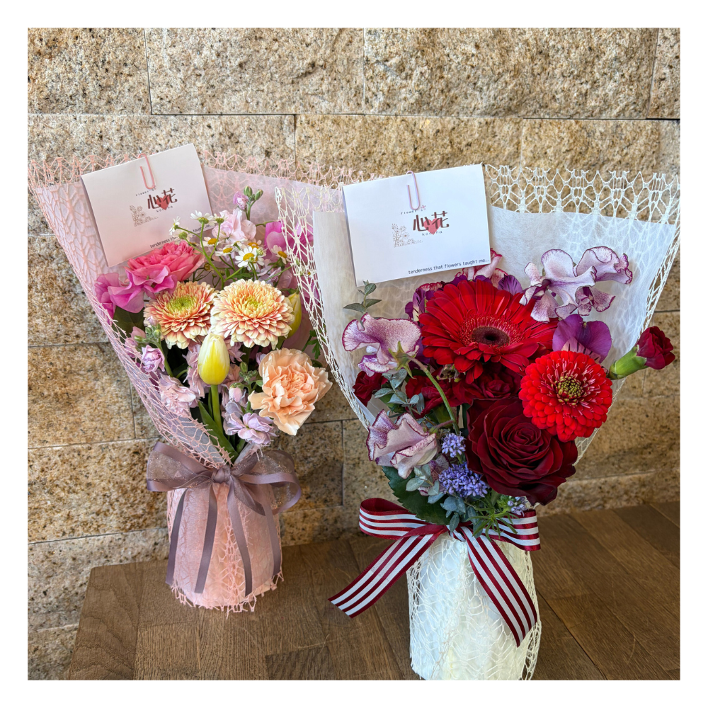 - 使用花材:カーネーション、スプレーバラ、ガーベラ、アストランチャア、スイートピー、グリーンなど季節の花材でおまかせとなります。